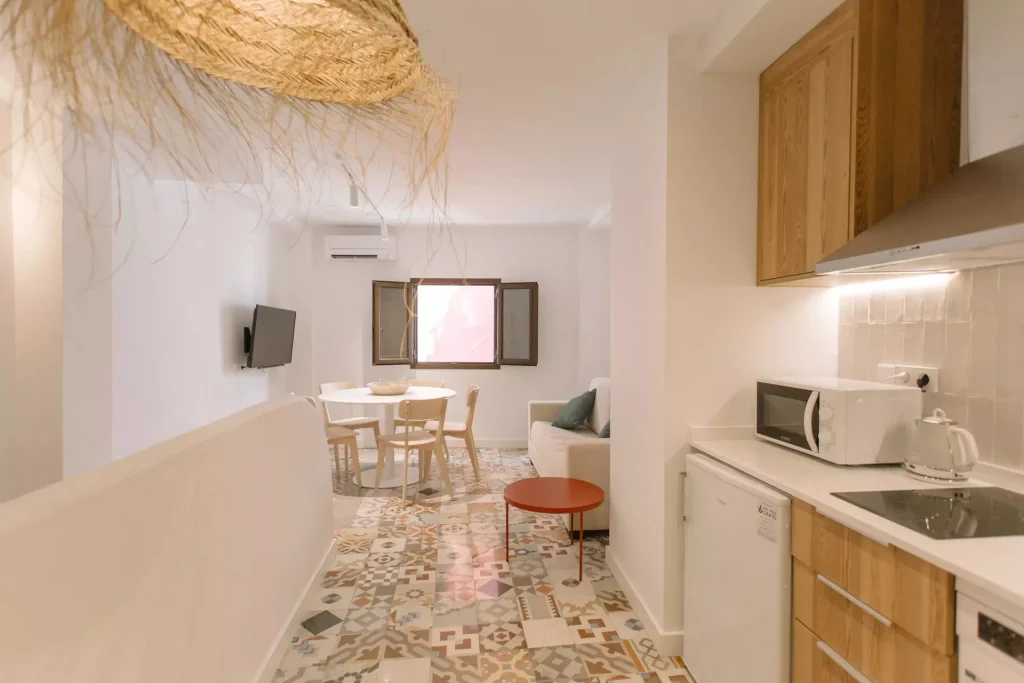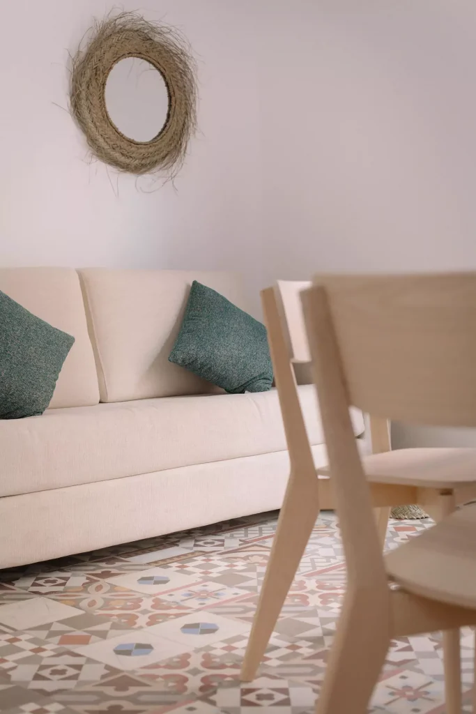 La decoración de estos apartamentos se inspira en las encantadoras fachadas de colores de Villajoyosa, logrando una fusión perfecta entre lo moderno y lo tradicional. Los azulejos, típicos de Villajoyosa, se encuentran presentes tanto en los suelos como en las paredes, añadiendo ese toque auténtico y característico al ambiente.