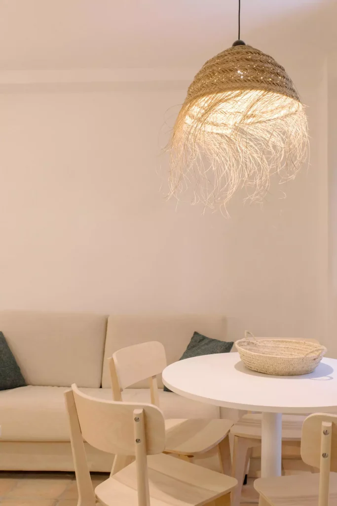 Las habitaciones están impregnadas de un encanto artesanal que resalta y aprecia la artesanía local a través de su decoración. Un ejemplo de esto es la inclusión del esparto, que se encuentra en los apartamentos modernos pero conservando una esencia tradicional.
